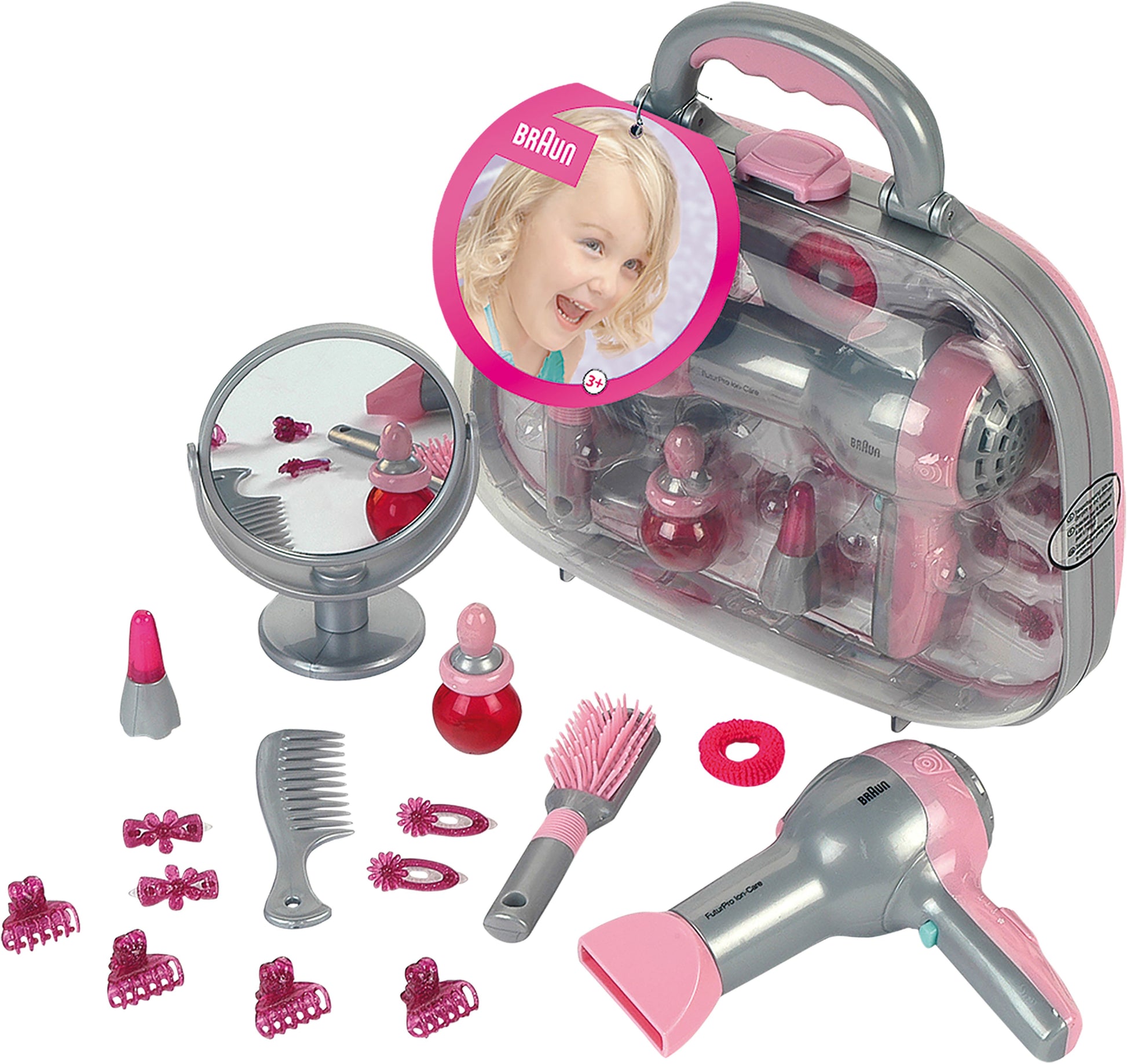 Frisierkoffer mit Braun Haartrockner - Batteriebetriebener Haartrockner mit Kaltluft Funktion - Ungefährlich - Keine Erhitzung des Haartrockners - Robuster Koffer mit praktischem Tragegriff - Originalgetreue Nachbildung des Haartrockners im Braun Design Mit vielem Styling Zubehör: 1 x Spiegel, 1 x Kamm, 1 x Bürste, 1 x Haargummi, 4 x Haarklammern, 4 x Haarspangen, 1 x Parfümfläschchen- und 1 x Lippenstiftattrappe - Geeignet für Kinder ab 3 Jahren