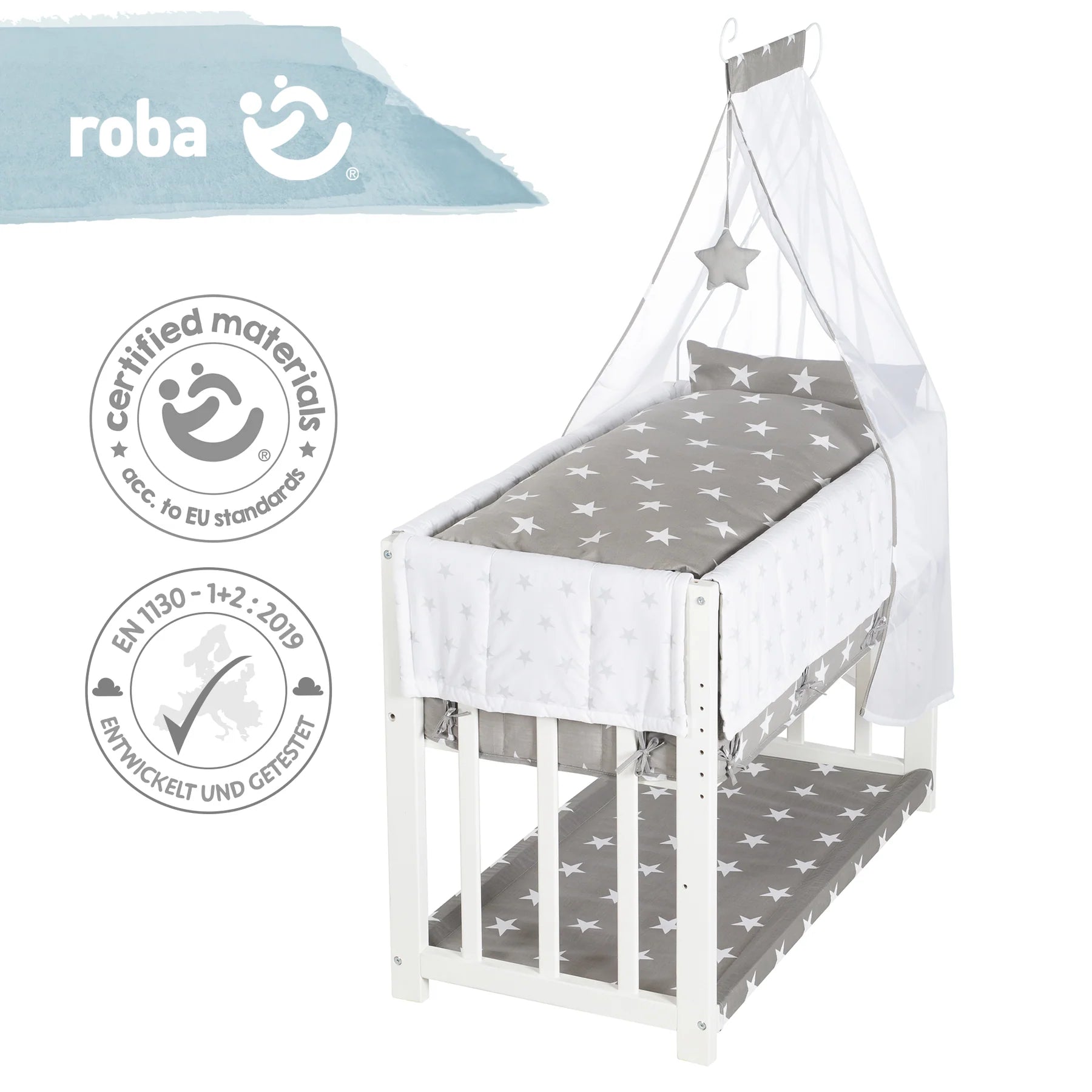 Das roba Stubenbett Babysitter 3 in 1 im niedlichen 'Little Stars' Design kommt inklusive Schaummatratze, Bettwäsche, Inlett, gepolstertem Nestchen, Himmel und Himmelstange.
