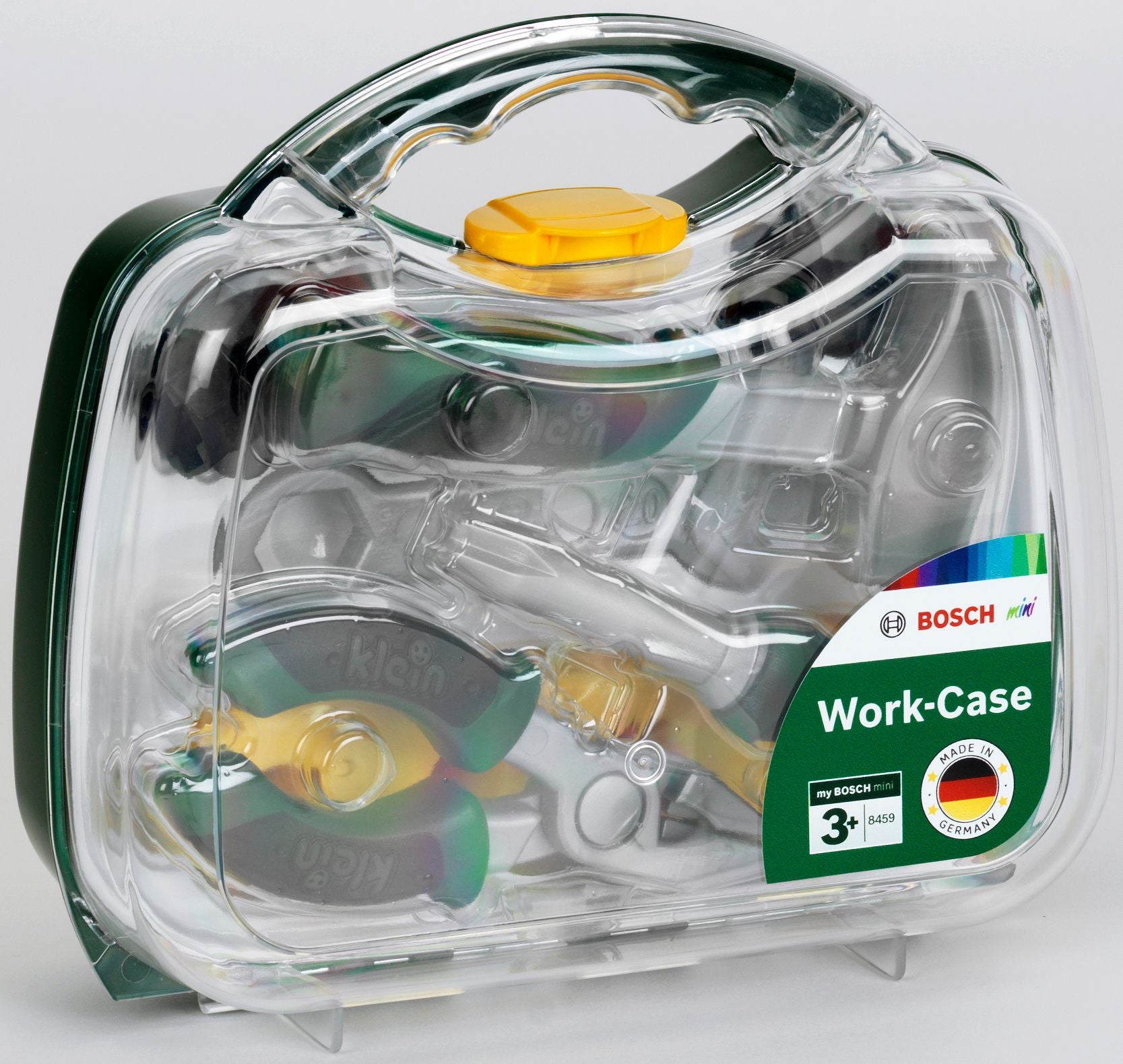 Mit praktischem Tragegriff und transparenter Frontseite Mit zahlreichen Zubehör für kleine Handwerker: Hammer, Zange, Schraubenschlüssel, Schraubendreher, Latten, Schrauben und Muttern. Ab 3 Jahren.
