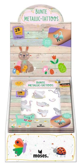 Dieses Set enthält 28 liebevoll gestaltete Tattoos auf zwei Bögen, die mit einem schimmernden Metallic-Effekt verzaubern. Die kindgerechten Motive wie Tiere, Blumen und Regenbögen lassen sich leicht auftragen und sorgen für funkelnde Highlights auf der Haut.