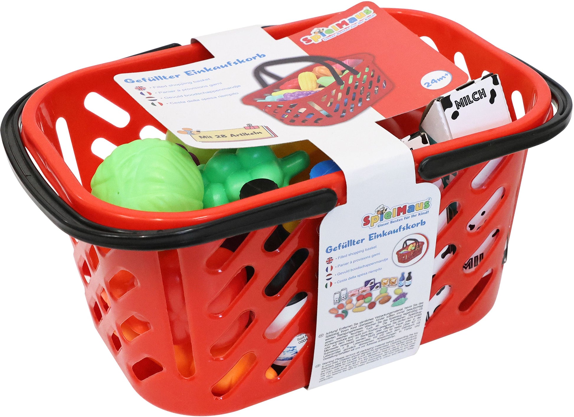 Der SpielMaus Küche Einkaufskorb mit verschiedenen Arten von Lebensmitteln. Insgesamt 29 Teile. Maße ca. 21x13x17 cm. Für Kinder ab 24 Monaten.