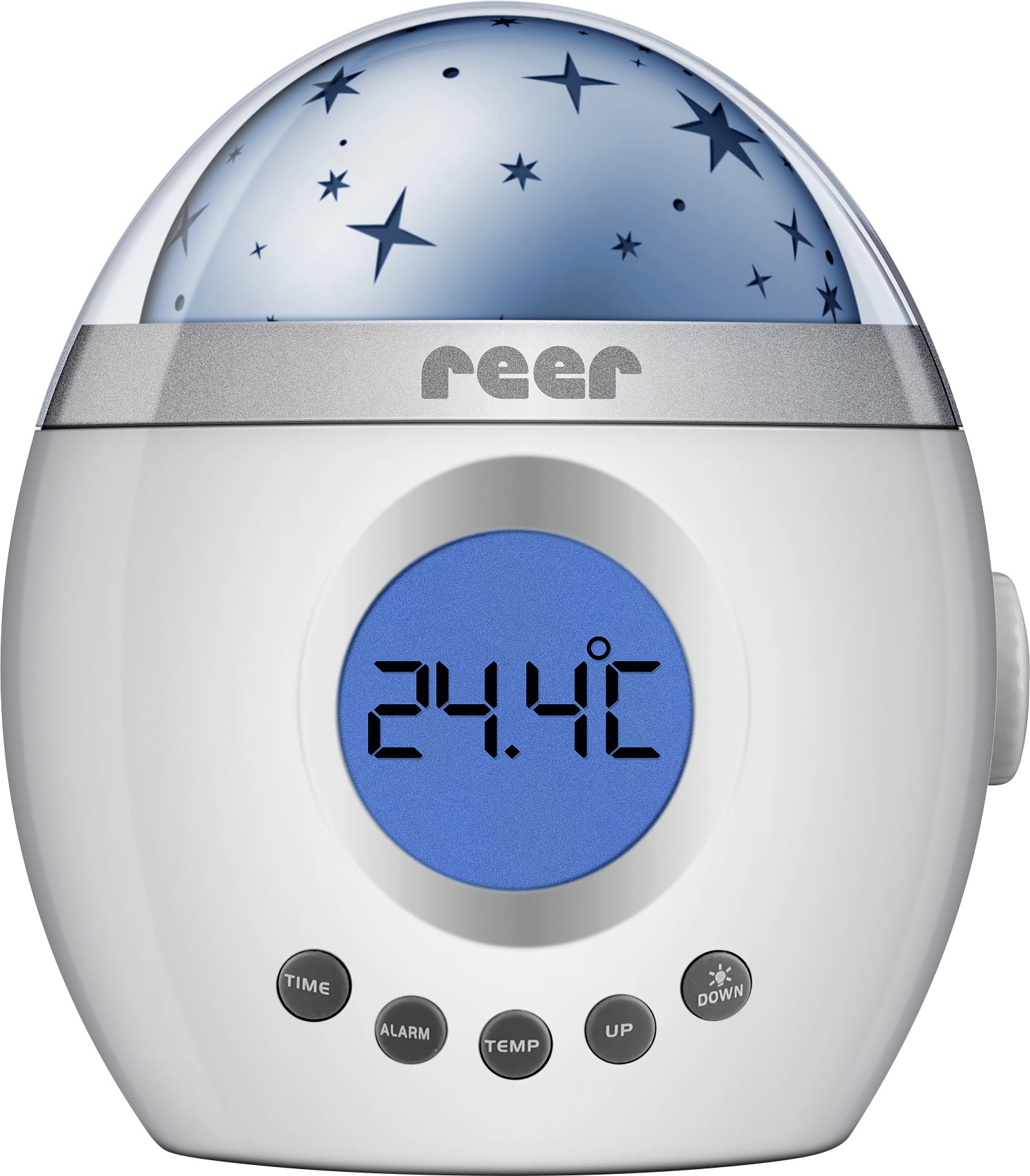 Hat ein beruhigende Lichtprojektion mit einem Sternenhimmel und farbwechsel.