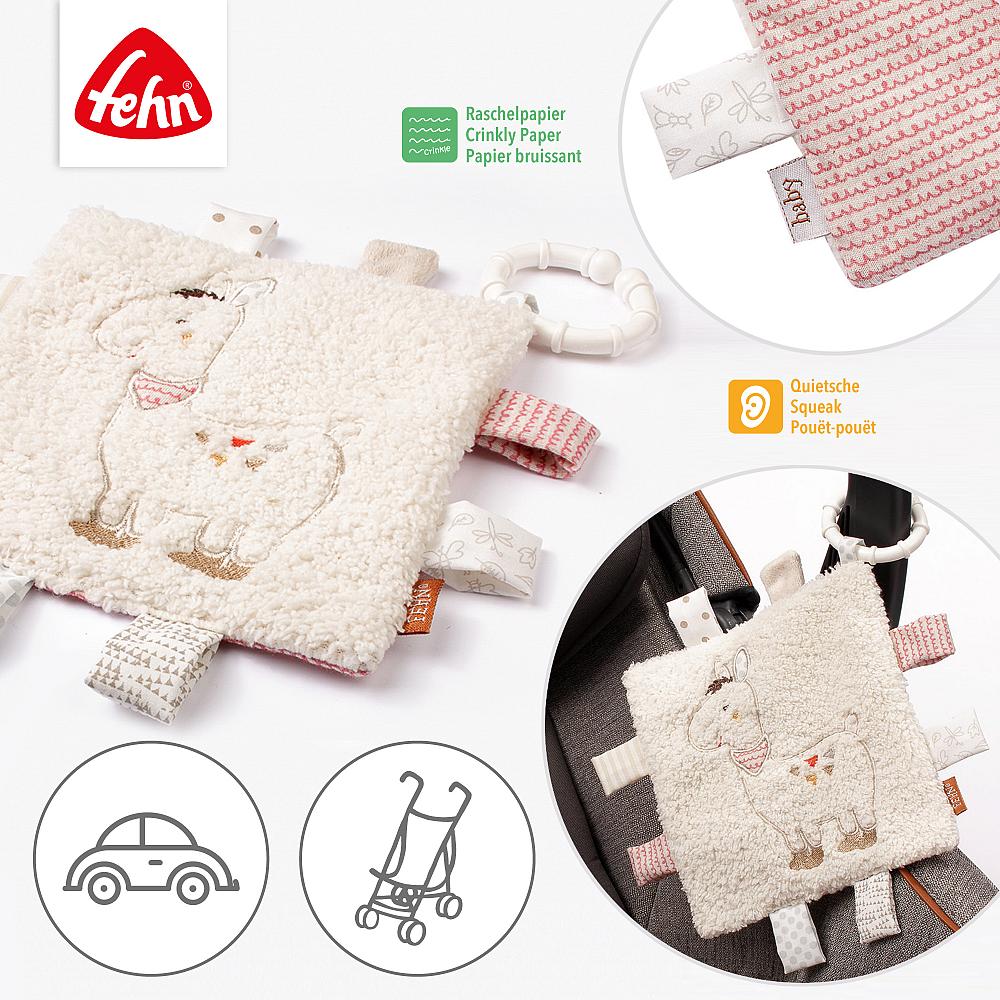 - Das niedliche Lama und die verschiedenen Laschen am Stofftuch laden zum Nuckeln und Ziehen ein und erobern mit interessanten Materialien das Herz des Babys im Nu