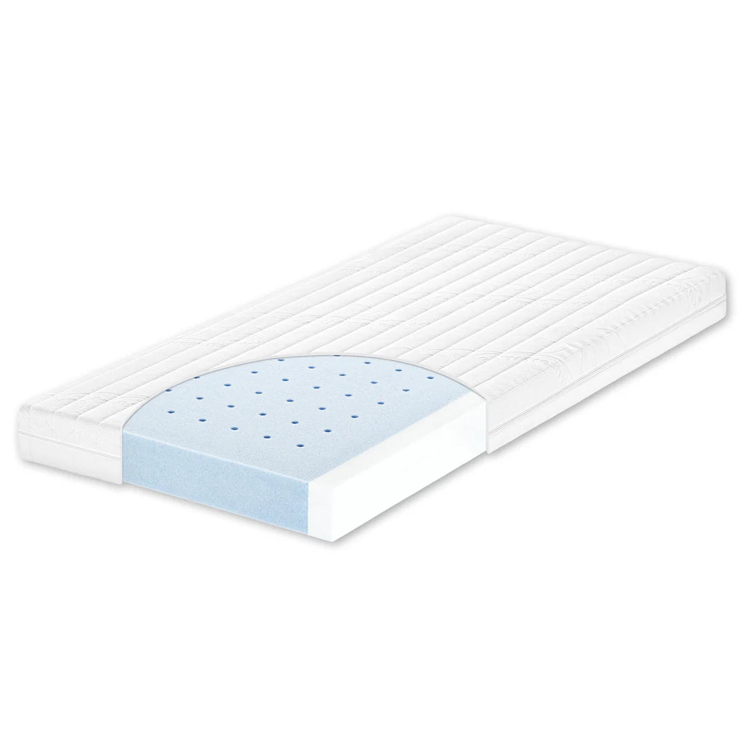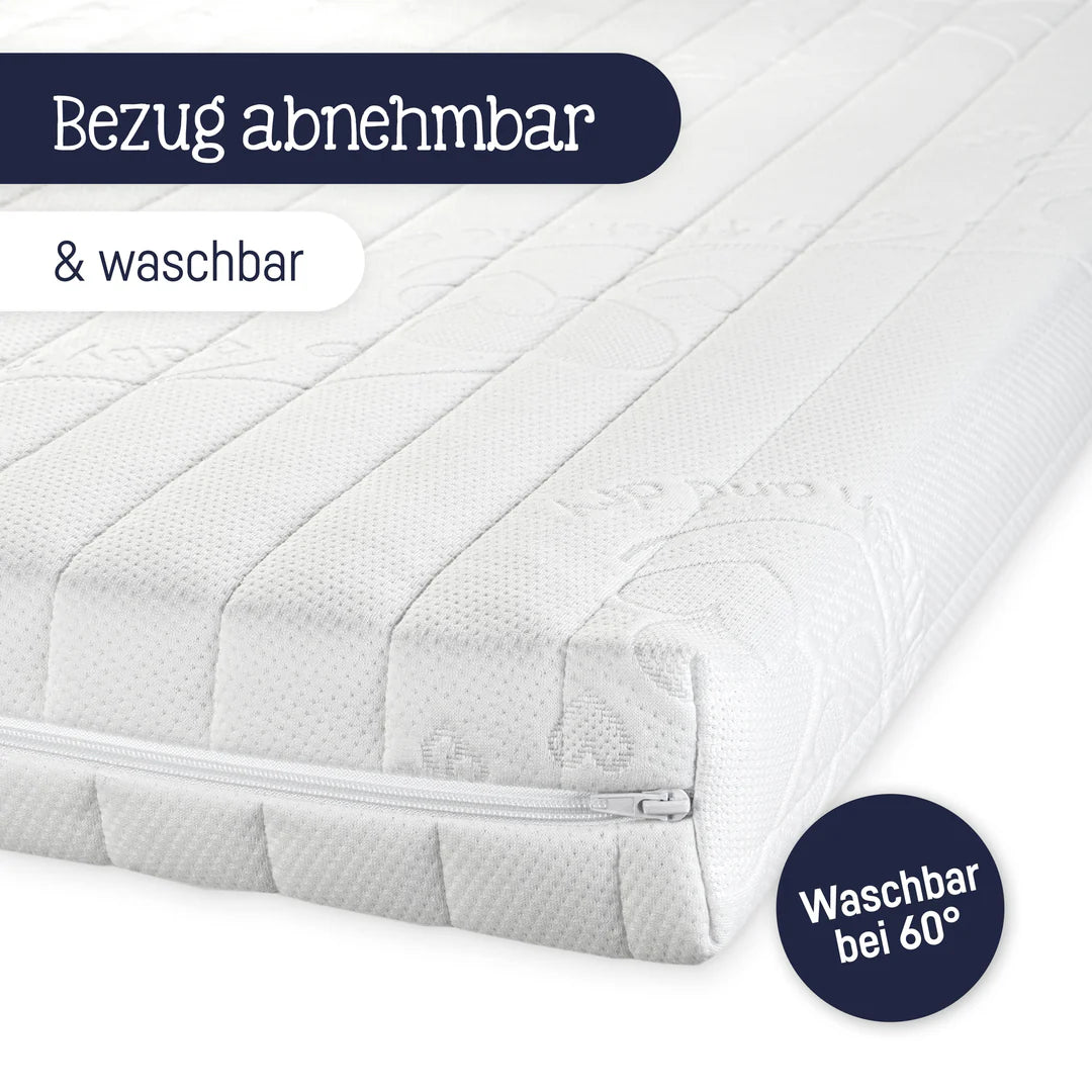 - Der atmungsaktive Kaltschaum und die vertikalen Ventilationskanäle sorgen für ein perfektes Schlafklima. Die Wirbelsäule wird dank des hochwertigen Kerns aus Kaltschaum optimal unterstützt. Die trittfesten Längskanten sorgen für Sicherheit bei den ersten Stehversuchen.