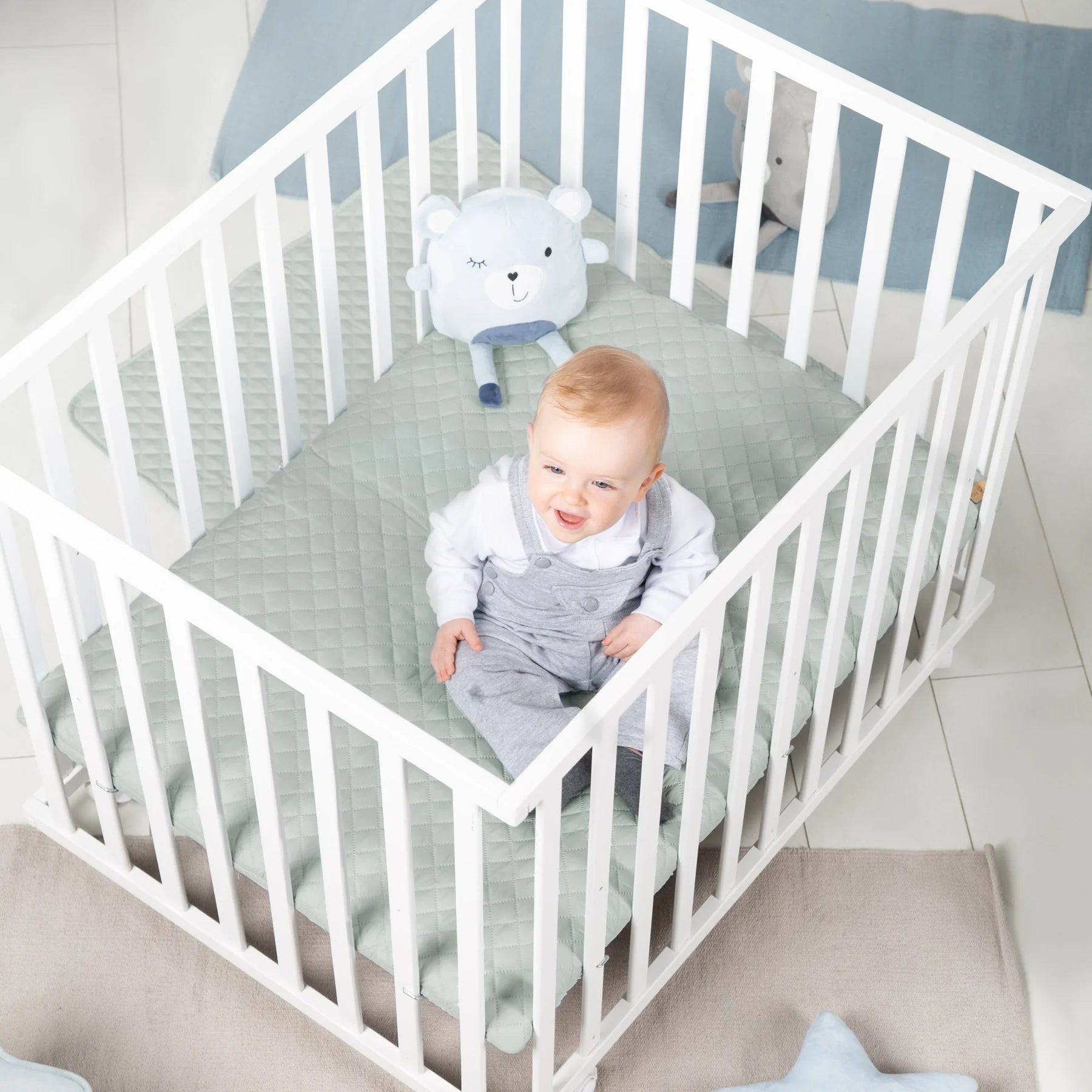 Das roba Laufgitter ist bis zu 15 kg belastbar und bietet eine stabile Spielfläche von 75 x 100 cm und ist mit einer weich gepolsterten, gesteppten hellgrünen Stoffeinlage ausgestattet.