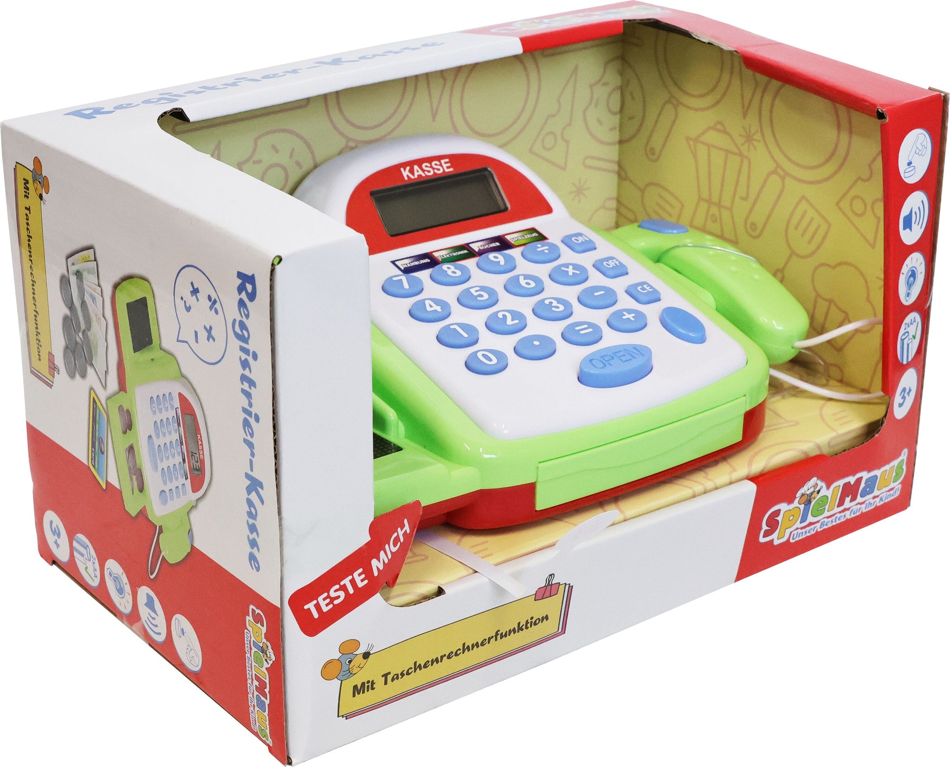 Die SpielMaus Küche Registrierkasse mit Zubehör. Die Kasse verfügt über eine Taschenrechnerfunktion und einem Scanner. Inklusive 2xAA Batterien. Maße ca. 23x15x9 cm. Für Kinder ab 3 Jahren.