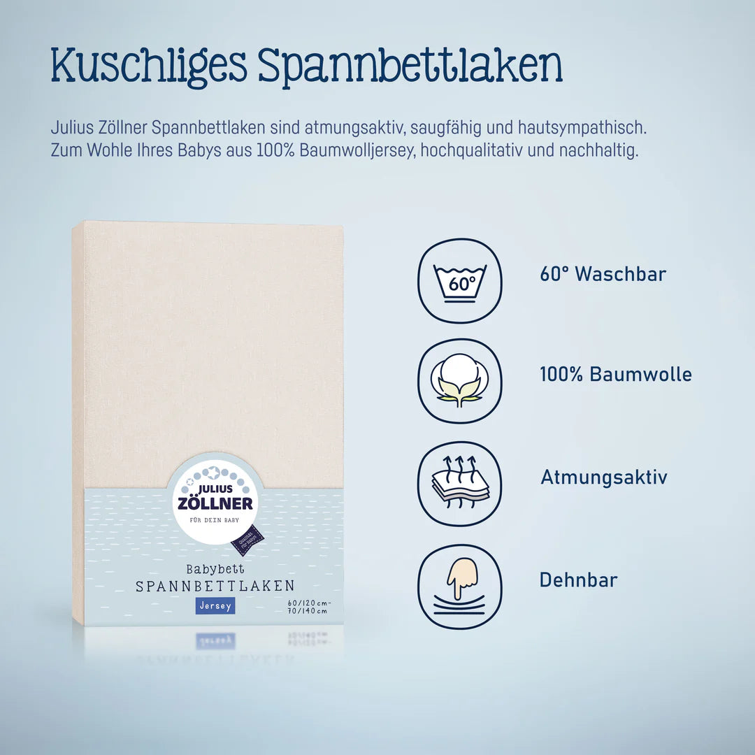 Das original Julius Zöllner Spannbetttuch. Kuscheliges, atmungsaktives und besonders saugfähiges Jersey Spannbettlaken aus 100% Baumwolle. Passend für Matratzen der Größen 60x120 cm bis 70x140 cm.