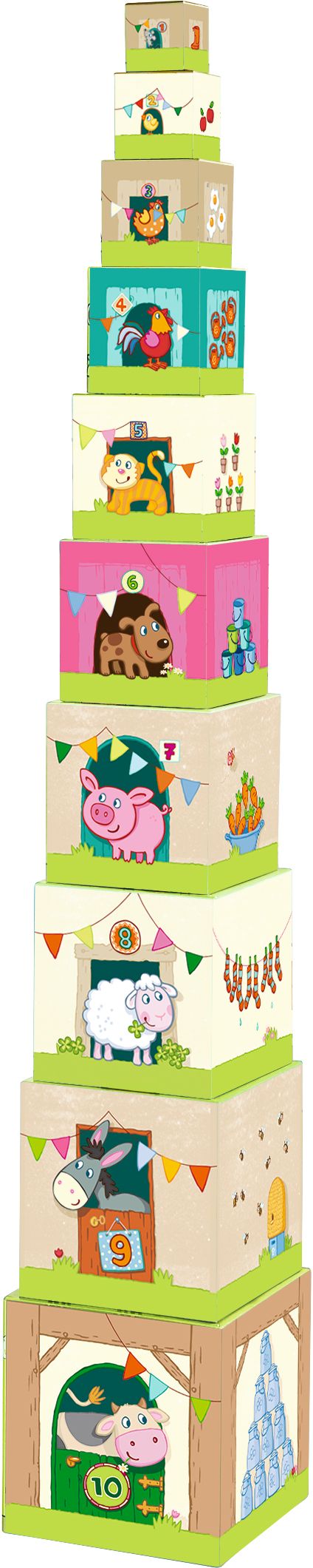 Spannender Stapelspaß für alle Bauernhof-Fans. Die Würfel können zu einem tollen Turm oder alle ineinander gestapelt werden. Auf den Außenseiten gibt es viele liebevoll gestaltete Abbildungen zu entdecken: Bauer Tim, sein Traktor und die Tiere. Außerdem können Kinder mit den Würfeln die Zahlen von 1 bis 10 kennenlernen.