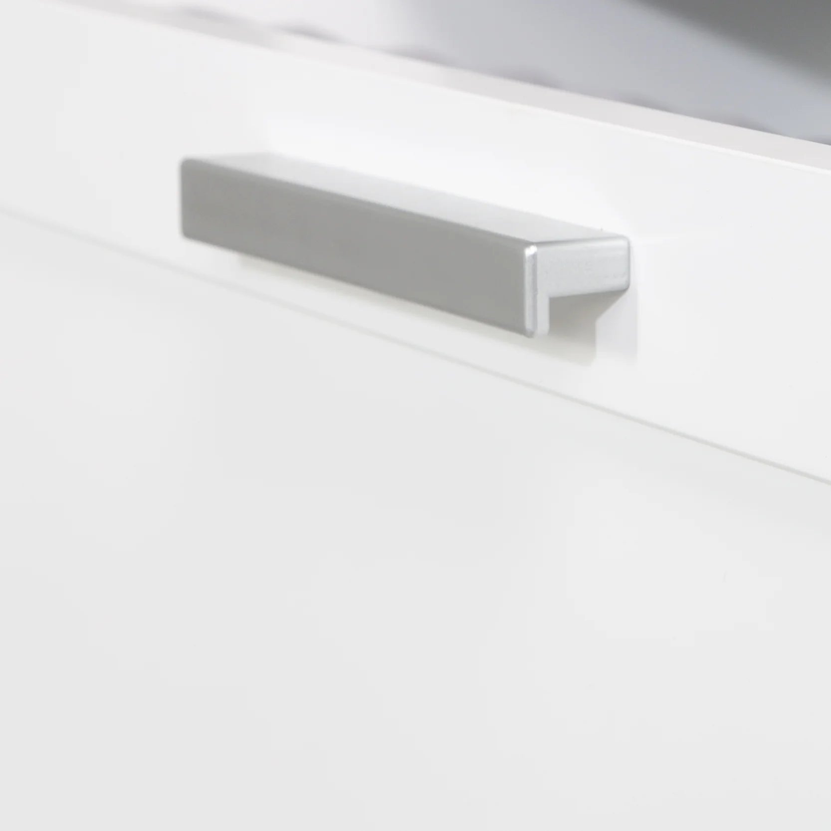 Hinter den zwei Türen mit modernen silbernen Griffen bietet die weiße Wickelkommode weiteren Stauraum für Wickelutensilien und Kleidungsstücke.