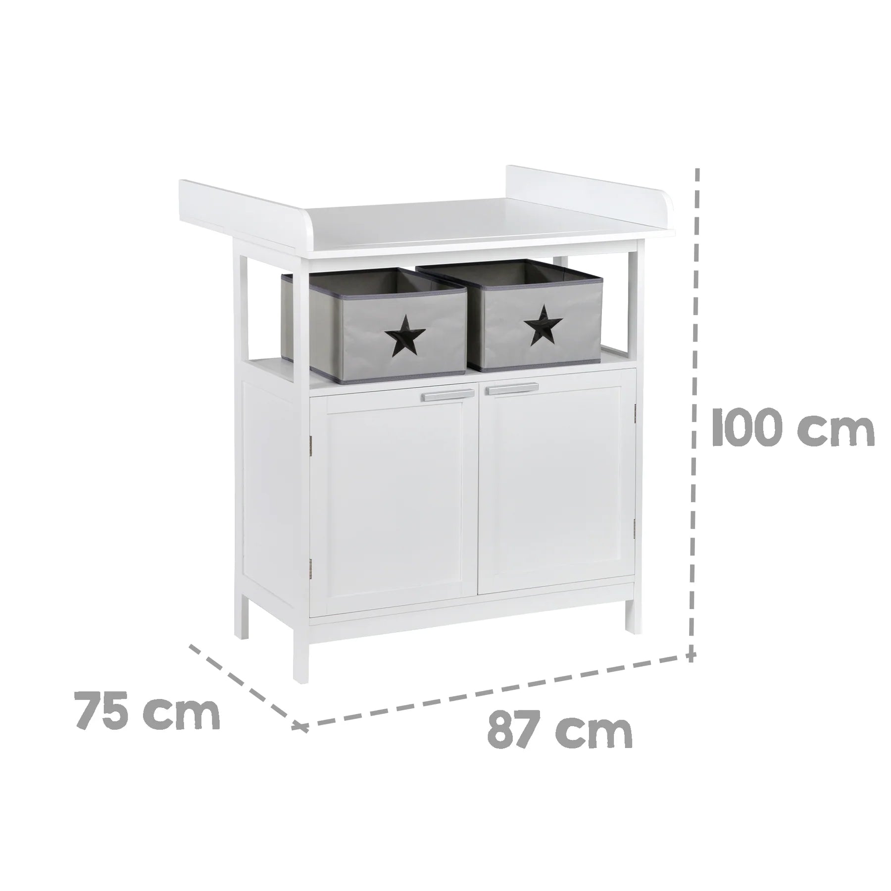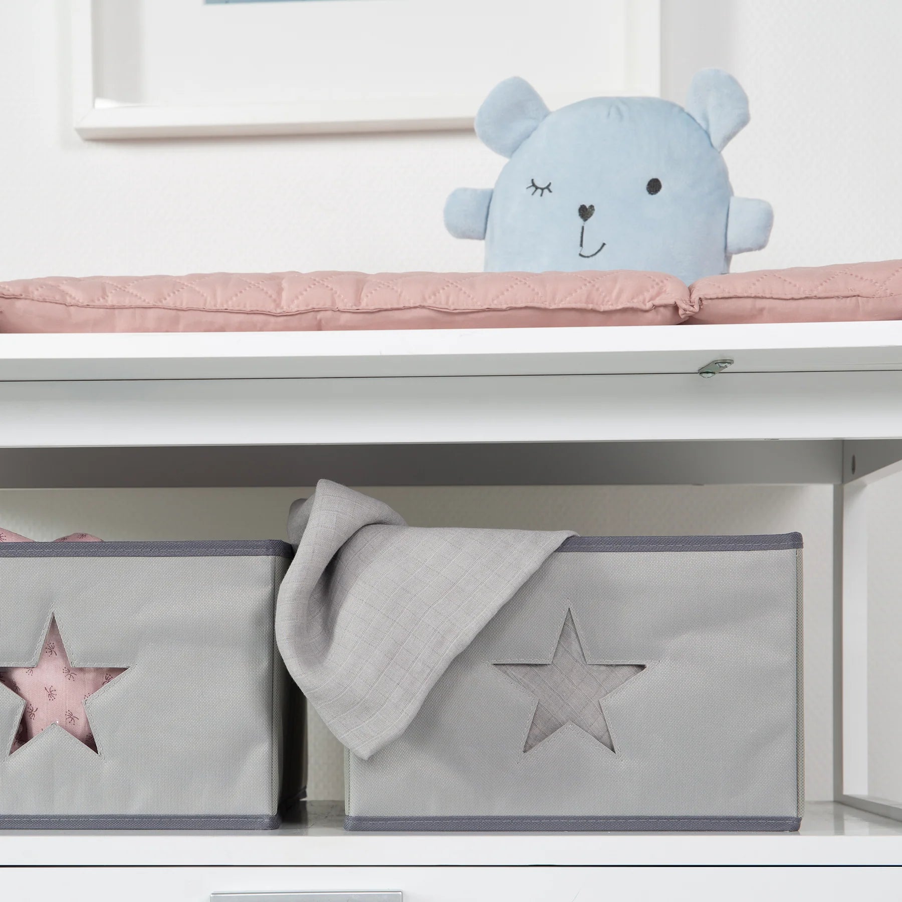 In den zwei Canvasboxen im offenen Fach zwischen der Wickelfläche und den 2 Türen der Wickelkommode in hochwertiger Rahmenoptik haben Sie bei der Babypflege alles schnell griffbereit.